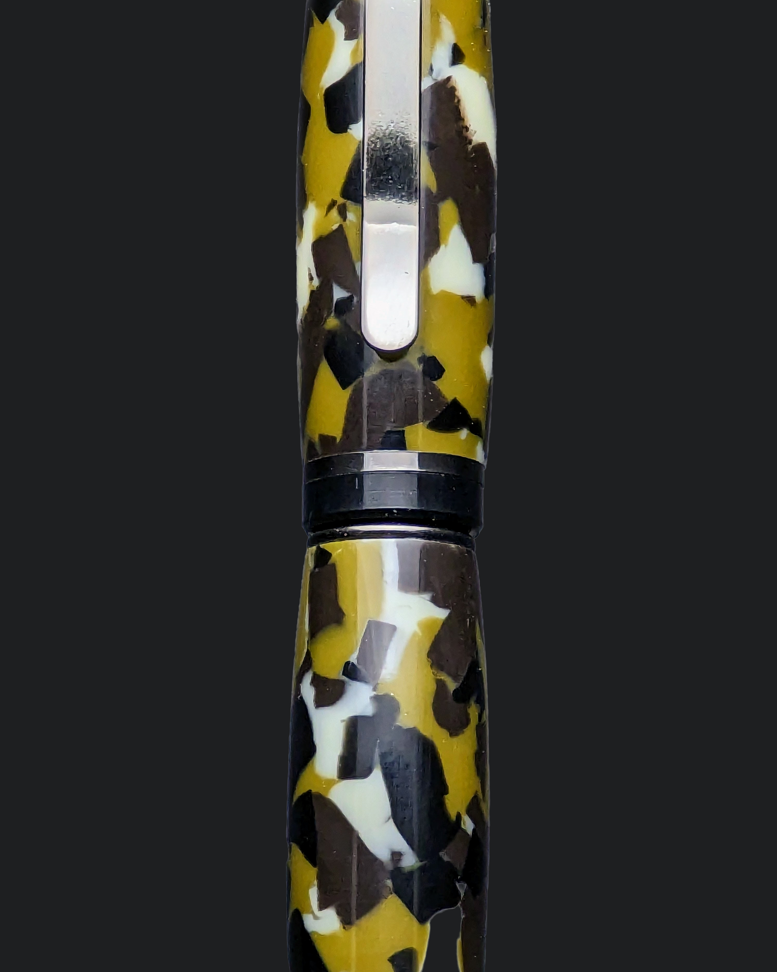 This is a weighty acrylic cigar twist pen with gun metal trim. The camouflage acrylic is quite unique. This pen would make a fantastic gift, or keep it for yourself. This pen would make a great every day carry pen with it's hefty weight and smooth writing. This pen was hand turned on a lathe, sanded, polished and buffed to a sheen. Multiple coats of wax was added to resist oil and fingerprints. Every pen is carefully inspected to ensure the utmost quality.
